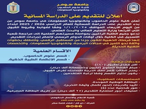 تُعلن كلية علوم الحاسوب وتكنولوجيا المعلومات في جامعة سومر عن بدء التقديم على الدراسة المسائية للعا ...